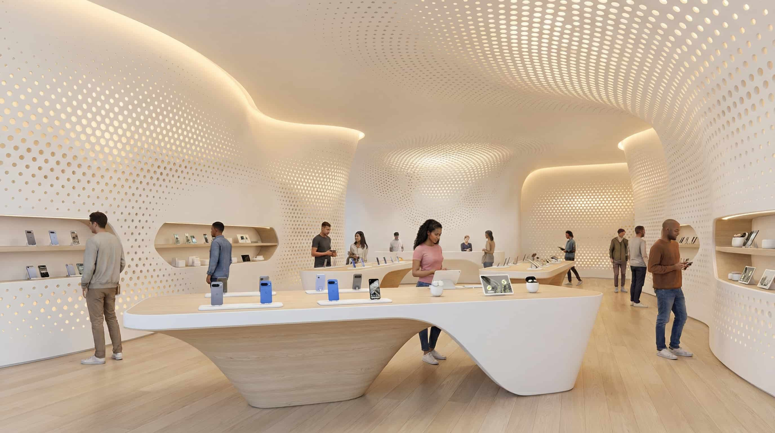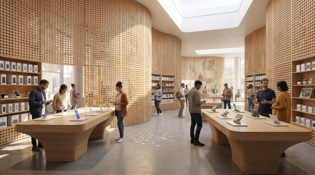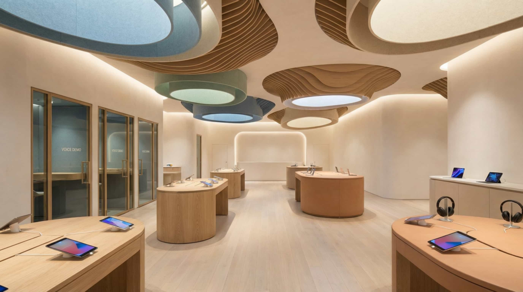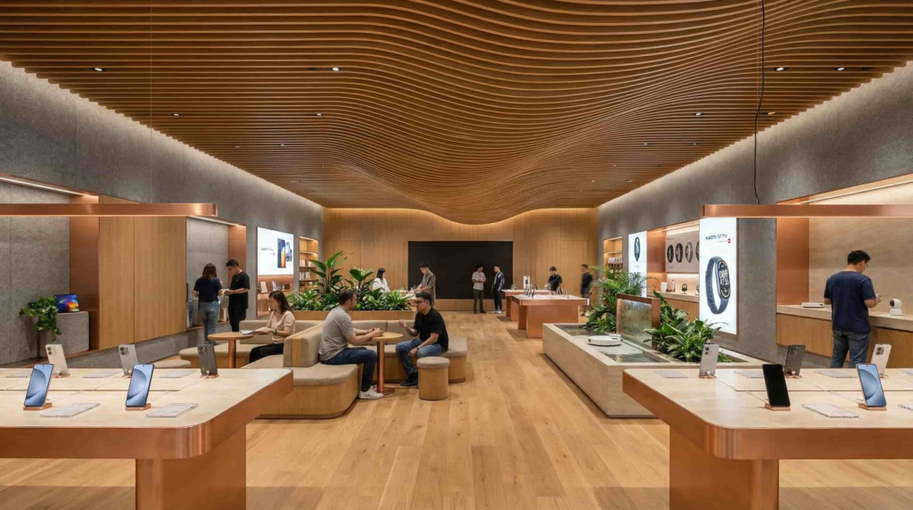 Spatial Strategy Organic Flow & Natural Materials — Flowing wood ceilings and warm timber create a sense of sanctuary, reducing tech anxiety while encouraging natural movement through product ecosystems.